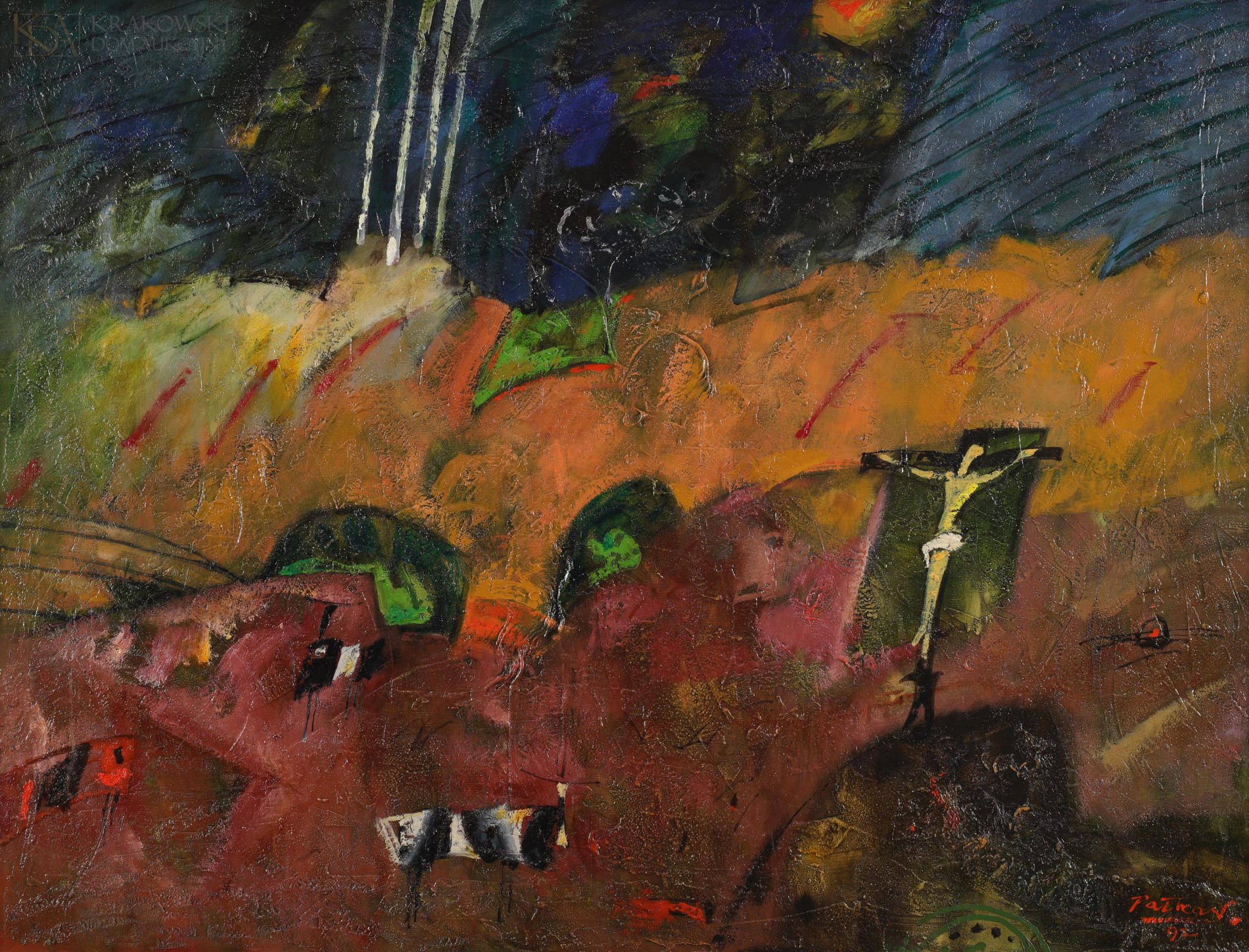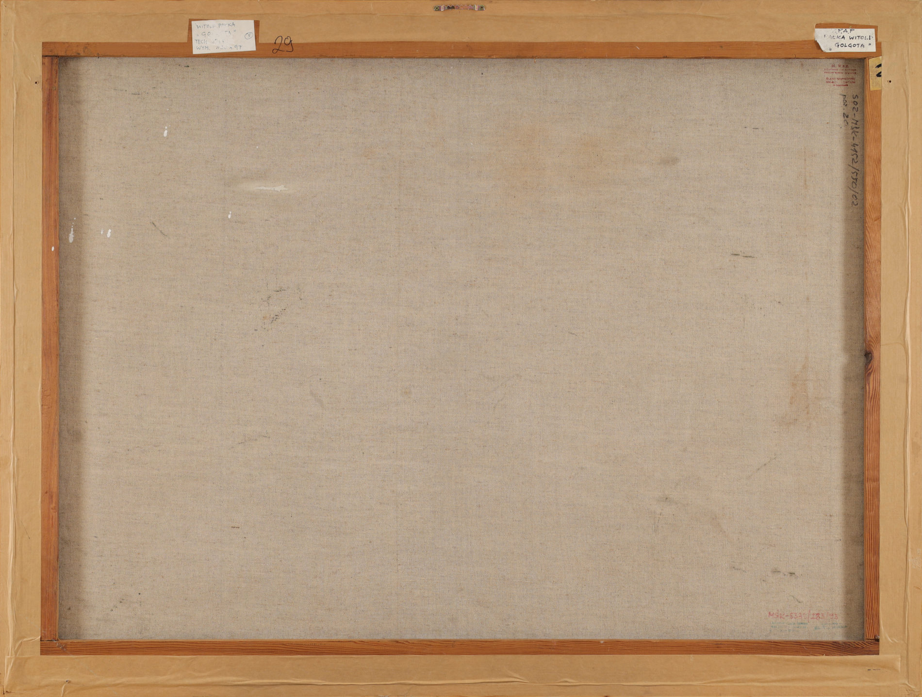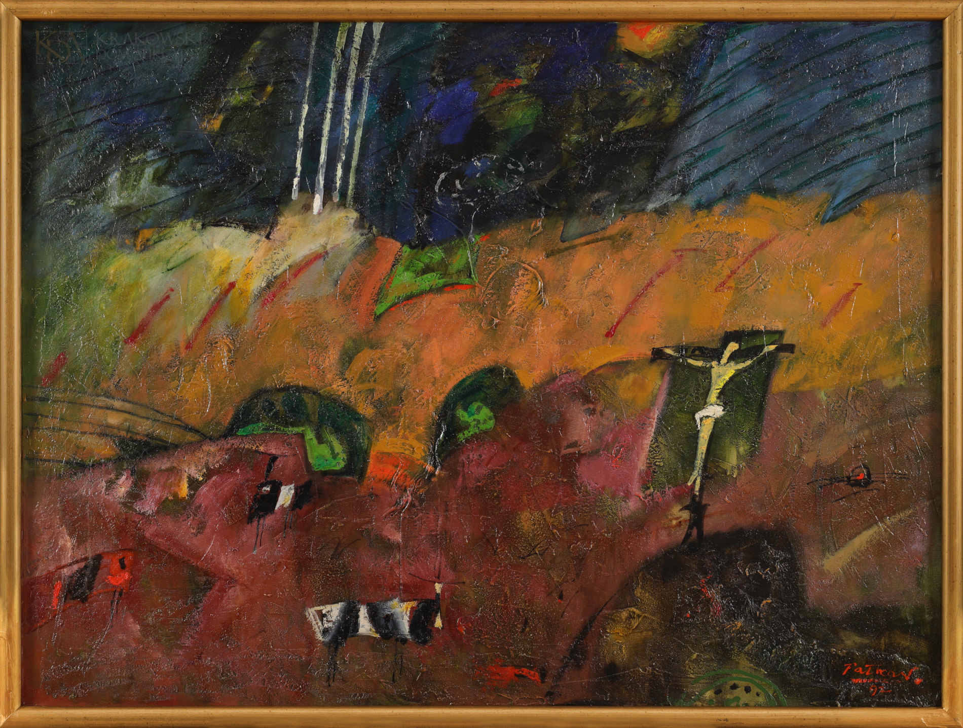 | Sygnowany i datowany p.d.: "Pałka W. | 92" Na odwrocie dwie odręczne metki z opisem obrazu. Obraz wymieniany i reprodukowany w katalogu "Witold Pałka - Malarstwo/Malerei - 50 lat pracy twórczej" (Muzeum Śląskie w Katowicach, Katowice 2002, s. nn.) oraz reprodukowany w publikacji E. Krzeszowskiej "Witold Pałka. Malarstwo" (Muzeum Historii Katowic, Katowice 2018, poz. 14). Obraz był eksponowany na wystawach: - "Witold Pałka - Malarstwo - 50 lat pracy twórczej", Muzeum Śląskie w Katowicach, styczeń-luty 2002; - "Witold Pałka - Synteza obserwacji i emocji pozytywnych", Muzeum Historii Katowic, wrzesień 2018-styczeń 2019; - "Witold Pałka. Malarstwo", Pałac Sztuki, Kraków, marzec-maj 2024. | |