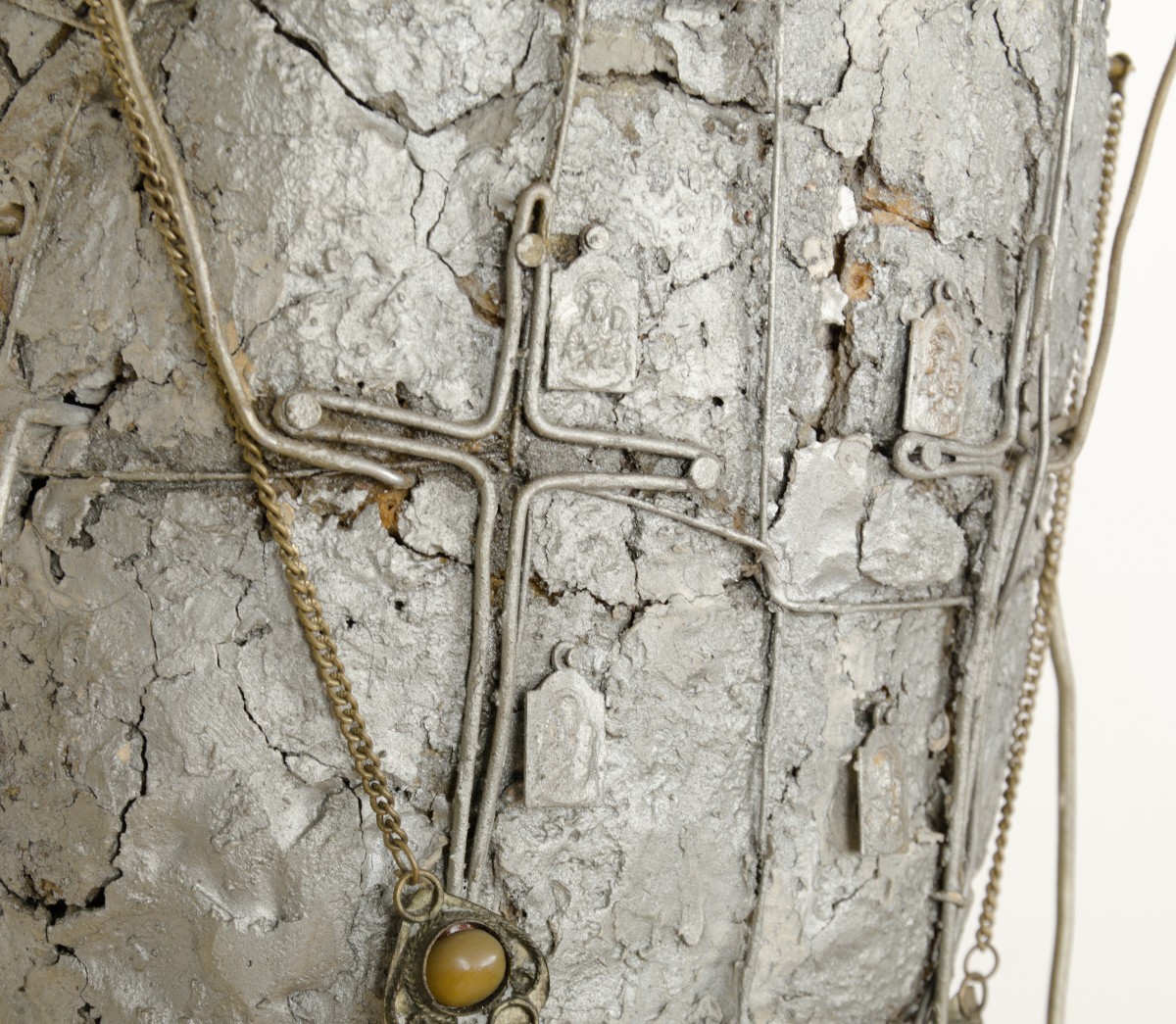 | PROWENIENCJA: - kolekcja prywatna, - dar od artysty. OPIS PRACY: „Święty chleb” powstał w latach 60., czyli w okresie, z którego pochodzą najwybitniejsze prace Władysława Hasiora konstruowane ze „zużytych rekwizytów codzienności”. W monochromatycznej, stworzonej z różnorodnych materiałów (m.in. metalu, szkła, kamienia) rzeźbie artysta zestawia ze sobą archetypiczne treści o charakterze religijnym. Tytuł dzieła pozwala zobaczyć w centralnej części rzeźby „święty” bochenek chleba, do którego przymocowane zostały medaliony z wizerunkiem Madonny oraz formowane na kształt krzyża łacińskiego druty, z których jeden, celtycki, wieńczy całą rzeźbę. Kształt omawianego obiektu przywodzi skojarzenia z zoomorficznym wyglądem owada, który na naszych oczach zdaje się przeradzać w motyla o delikatnych skrzydłach. Dodatkowy dialog z treściami religijnymi inicjują użyte przez artystę ozdoby – pierścień, naszyjnik i bransoleta o formach inspirowanych pradziejową biżuterią czasów przedchrześcijańskich. PRACA ZOSTAŁA SPRZEDANA NA III Aukcji Dzieł Sztuki w Krakowskim Domu Aukcyjnym (26 maja 2020) [zobacz więcej] | |