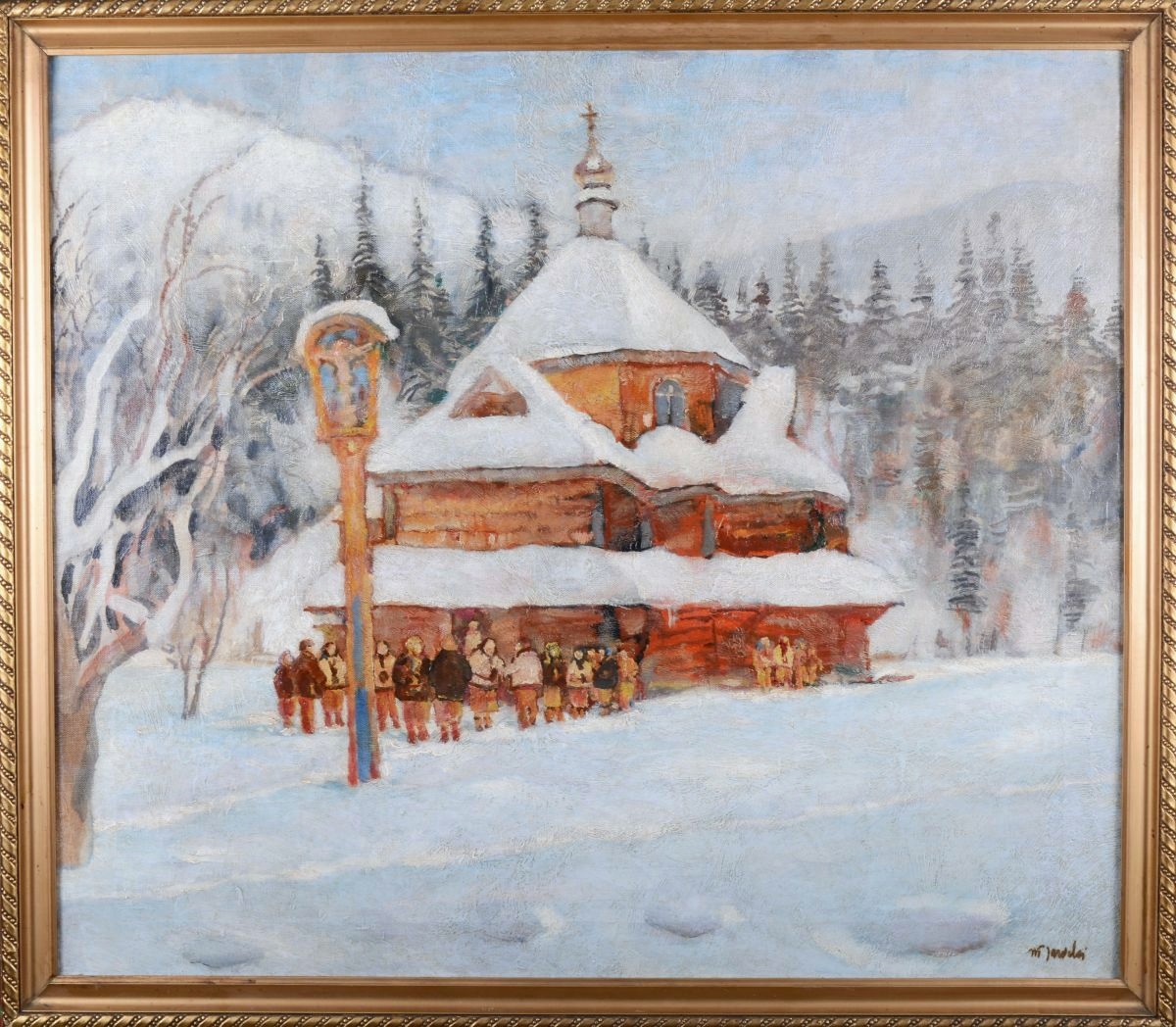 | sygnowany p.d.: "W Jarocki" opis pracy: Obraz ukazuje umiejscowioną w zimowym pejzażu górskim scenę rodzajową wyjścia wiernych z nabożeństwa. W centrum znajduje się drewniana cerkiew w Tatarowie, przed którą rozmawiają ze sobą ludzie w strojach kojarzących się z ubiorem regionalnych. Na pierwszy plan wysuwa się kapliczka – drewniany słup z figurą ukrzyżowanego Chrystusa. Tło stanowią pojedyncze, przyprószone śniegiem nagie drzewa, gęsty las iglasty oraz delikatnie rozmyte zarysy ośnieżonych gór. Stonowaną, rozbieloną kolorystykę obrazu przecinają pasowo akcenty barwne brązowo-czerwonej cerkwi i kapliczki. Obraz malowany jest szkicowo, na powierzchni widoczne są ślady pędzla. | |