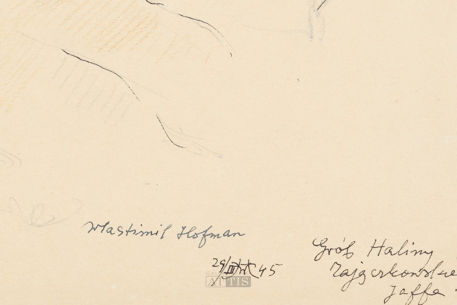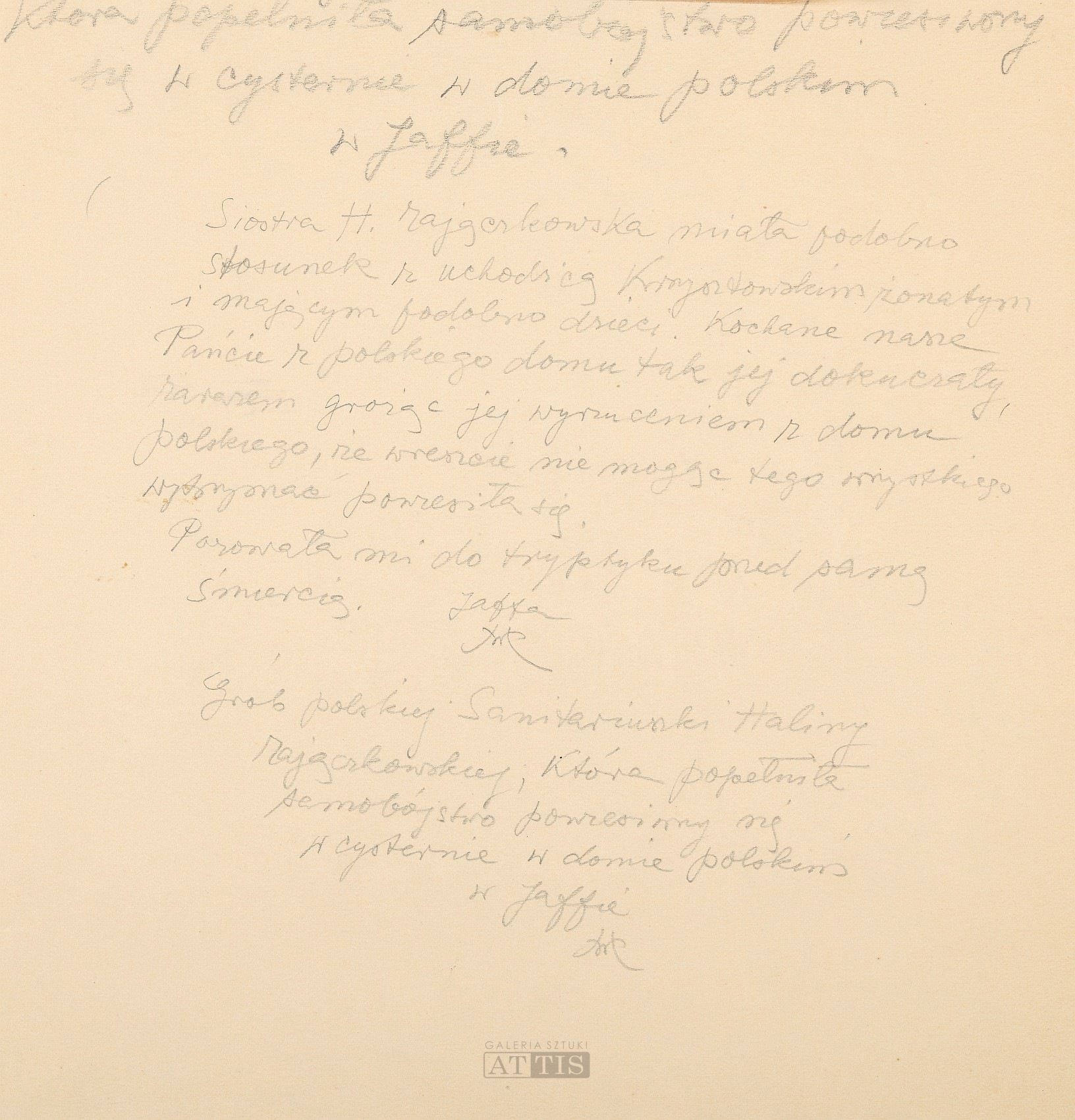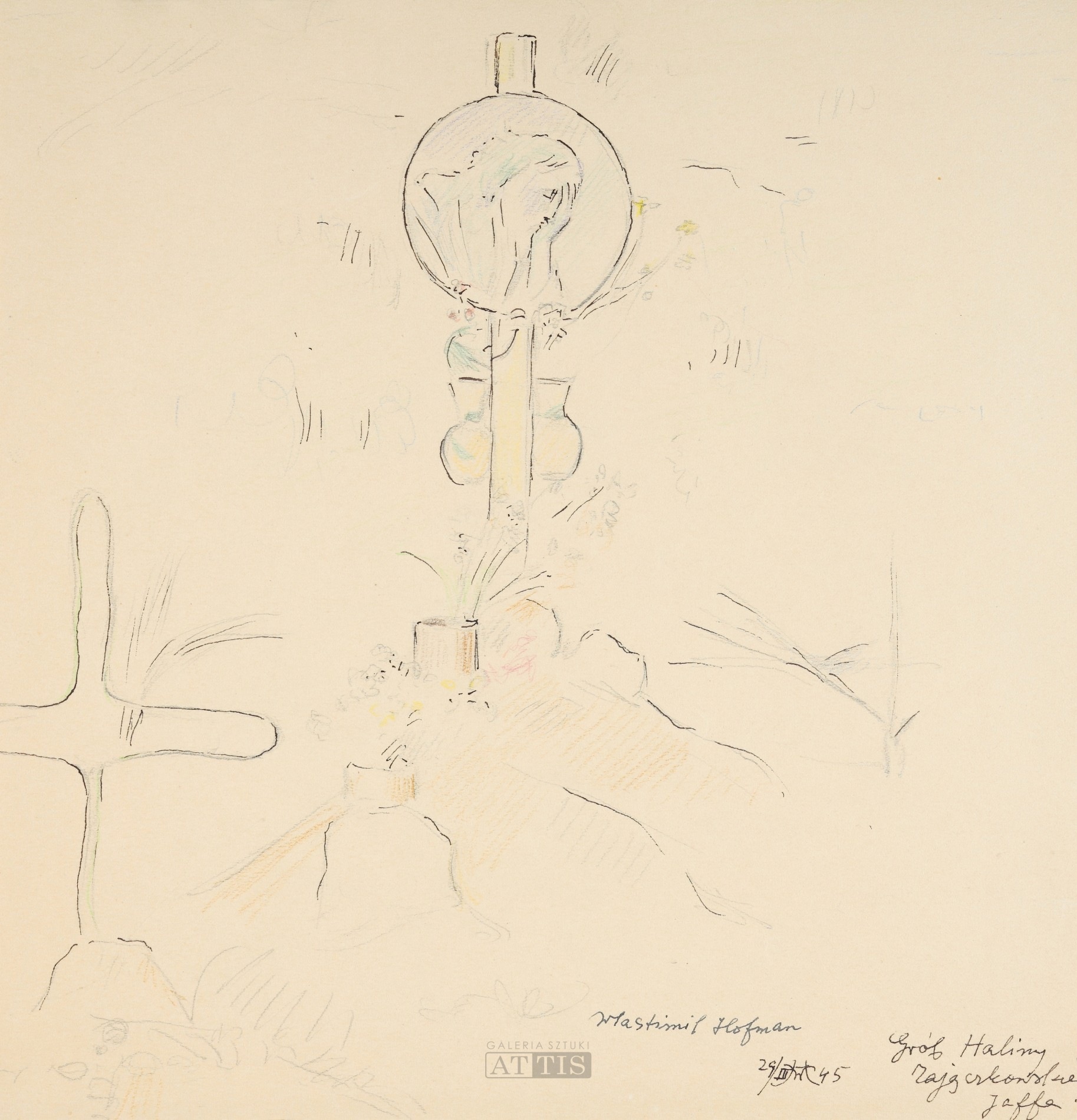 | Sygnowany i datowany p.d.: "Wlastimil Hofman | 29/III WH 45" Opisany p.d.: "Grób Haliny | Zajączkowskiej | Jaffa" Opisany ołówkiem na odwrocie: "która popełniła samobójstwo powiesiwszy | się w cysternie w domu polskim | w Jaffie. | Siostra H. Zajączkowska miała podobno | stosunek z uchodźcą Krzysztowskim żonatym | i mającym podobno dzieci. Kochane nasze | Pańcie z polskiego domu tak jej dokuczały, | zarazem grożąc jej wyrzuceniem z domu | polskiego, że wreszcie nie mogąc tego wszystkiego | wytrzymać powiesiła się. | Pozowała mi do tryptyku przed samą | śmiercią. | Jaffa | WH"; "Grób polskiej Sanitariuszki Haliny | Zajączkowskiej, która popełniła | samobójstwo powiesiwszy się | w cysternie w domu polskim | w Jaffie | WH" | |
