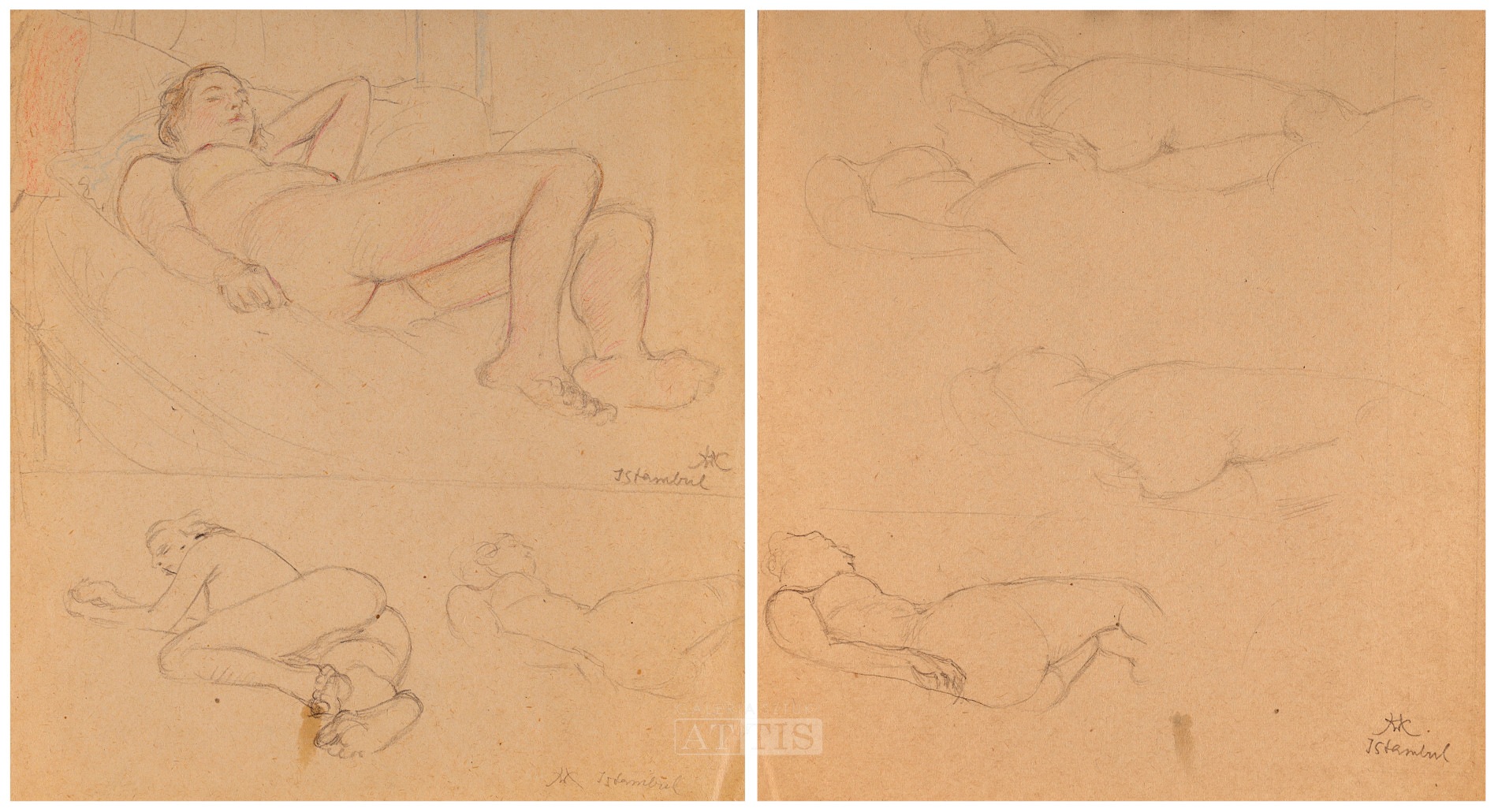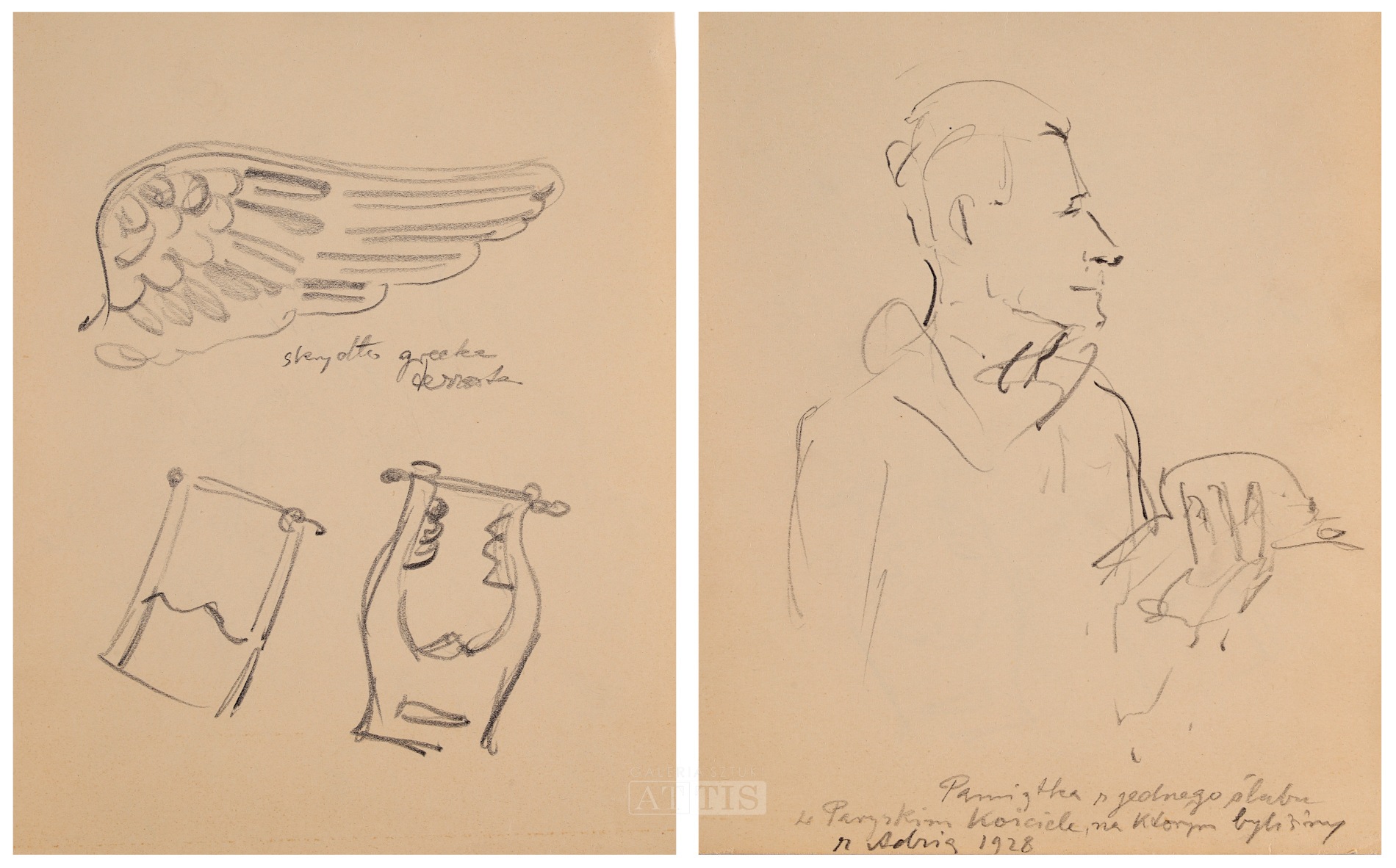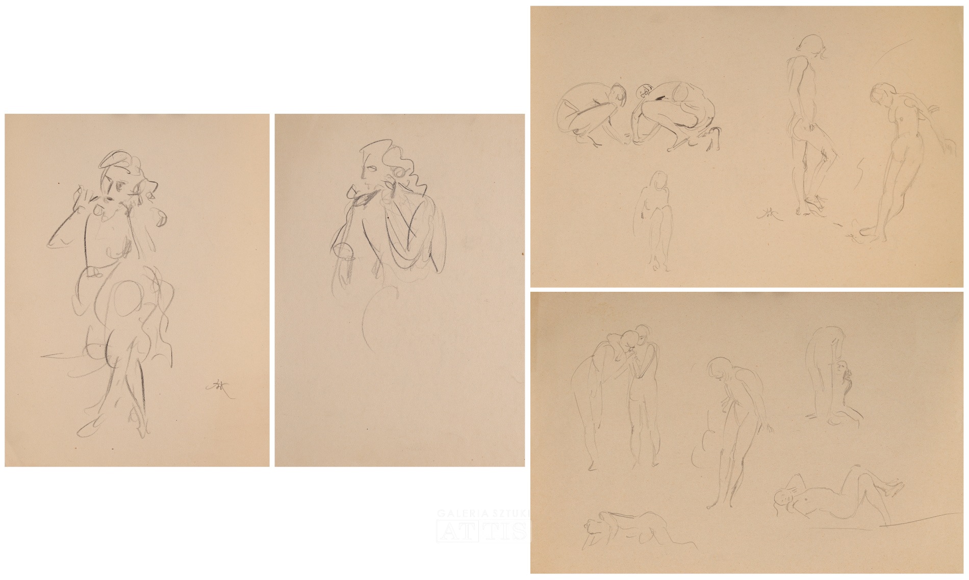 | 1. Wlastimil Hofman, "Satyr" (praca dwustronna) Technika: ołówek, papier Wymiary: 20 x 14,8 cm Sygnowany p.d. monogramem: "WH" 2. Wlastimil Hofman, "Akty - studia sytuacyjne" (praca dwustronna) Technika: ołówek, papier Wymiary: 15,6 x 23,6 cm Sygnowany p.d. monogramem: "WH" 3. Wlastimil Hofman, "Akty kobiece" (praca dwustronna) Technika: kredka, ołówek, papier Wymiary: 21 x 19,2 cm Sygnowany p.śr. monogramem: "WH" i opisany: "Istambul" Sygnowany p.d. monogramem: "WH" i opisany: "Istambul" Sygnowany na odwrocie p.d. monogramem: "WH" i opisany: "Istambul" 4. Wlastimil Hofman, "Szkice greckie | Pamiątka ślubu" (praca dwustronna) Technika: ołówek, papier Wymiary: 21,7 x 17,2 cm Opisany śr.: "skrzydło grecka | terracota" [?] Opisany na odwrocie p.d.: "Pamiątka z jednego ślubu | w Paryskim Kościele, na którym byliśmy | z Adzią 1928" | |