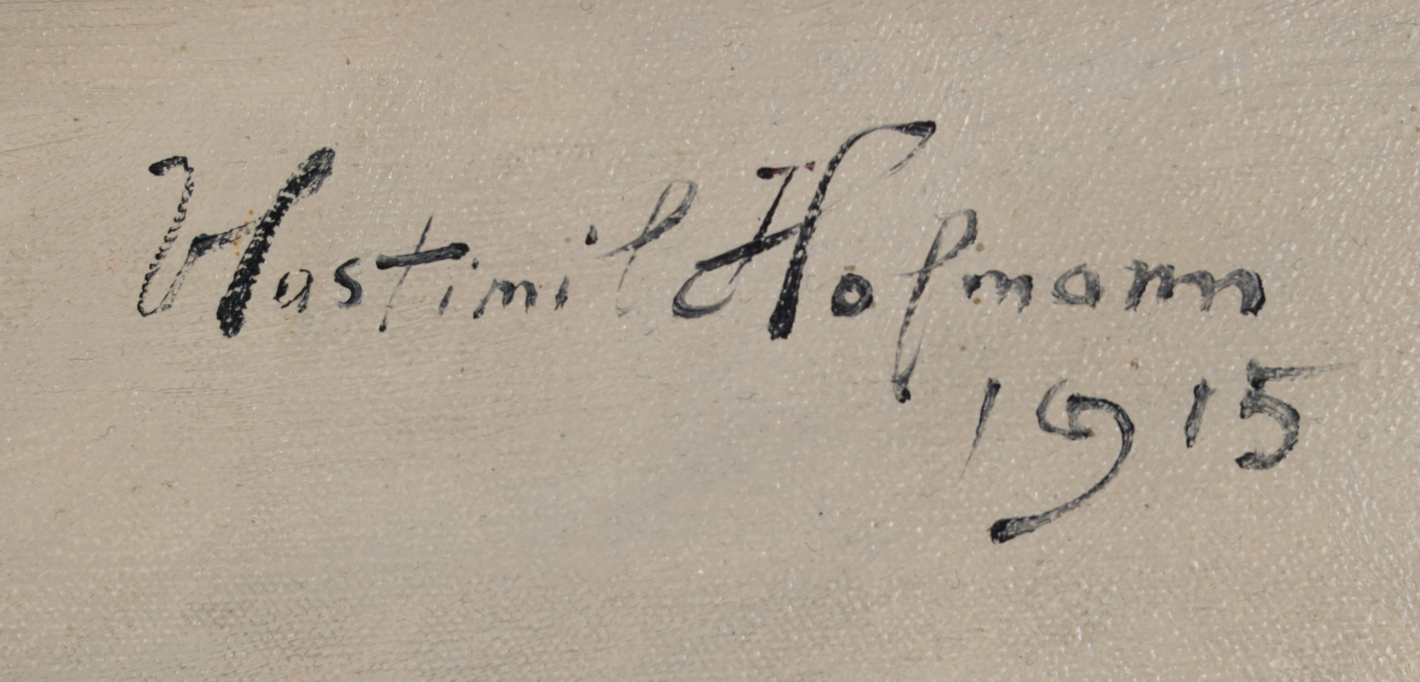 | Sygnowany i datowany p.g.: "Vlastimil Hofmann | 1915" Na blejtramie pieczęć praskiego sklepu z przyborami malarskimi Ludvíka Císařa. OPIS PRACY: Wlastimil Hofman, choć znany głównie z symbolicznych scen o melancholijnej nastrojowości, był również sprawnym portrecistą. Oferowane płótno pochodzi z drugiej dekady XX wieku - jednego z najbardziej cenionych okresów twórczości Wlastimila Hofmana. Czas powstania wpływa też na odmienną od późniejszych sygnaturę - w roku 1915 artysta jeszcze podpisywał się czeskim, niespolszczonym imieniem i nazwiskiem, jako Vlastimil Hofmann. Obraz stanowi reprezentacyjny, półpostaciowy portret oficera armii Austro-Węgier, pełniącego w służbie zawód lekarza pułkowego (Regimentsarzt). O randze żołnierza świadczy jego mundur oraz patki kołnierzowe. Na lewej piersi mężczyzny widnieją trzy odznaczenia wojskowe, stanowiące kolejno Medal Jubileuszowy Pamiątkowy dla Sił Zbrojnych i Żandarmerii, Krzyż Jubileuszowy Wojskowy oraz Krzyż Pamiątkowy Mobilizacji 1912-1913. Elementy te oddane zostały przez artystę z należytą starannością, dzięki której są identyfikowalne. | |