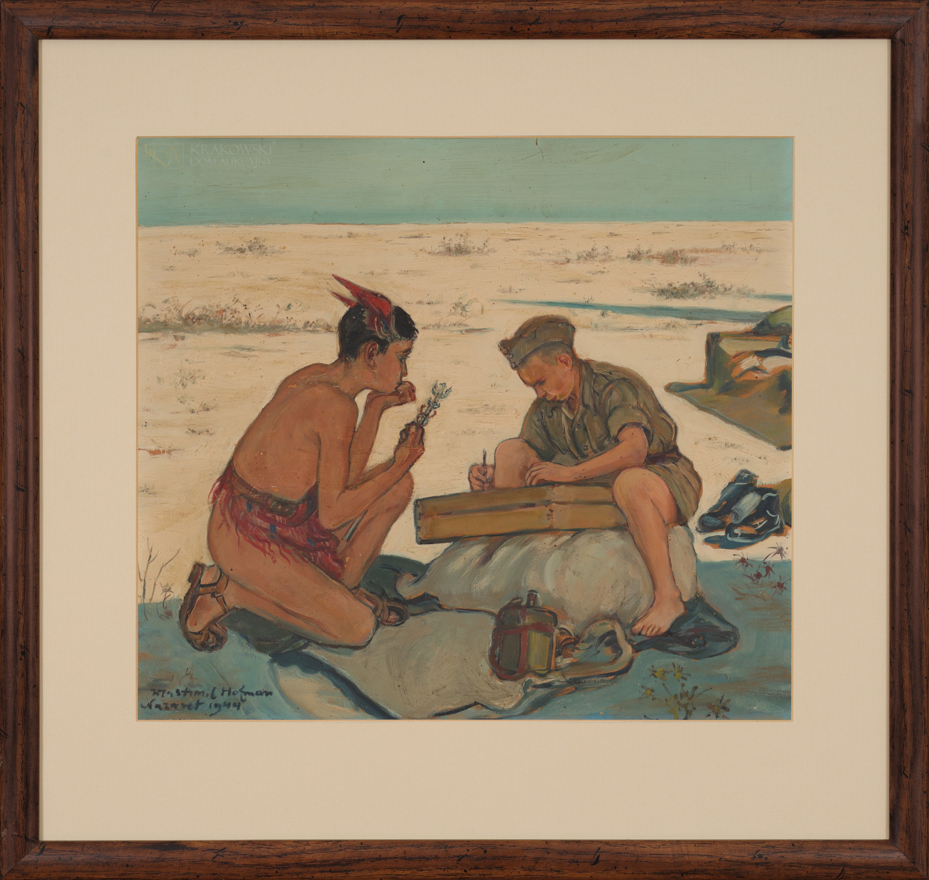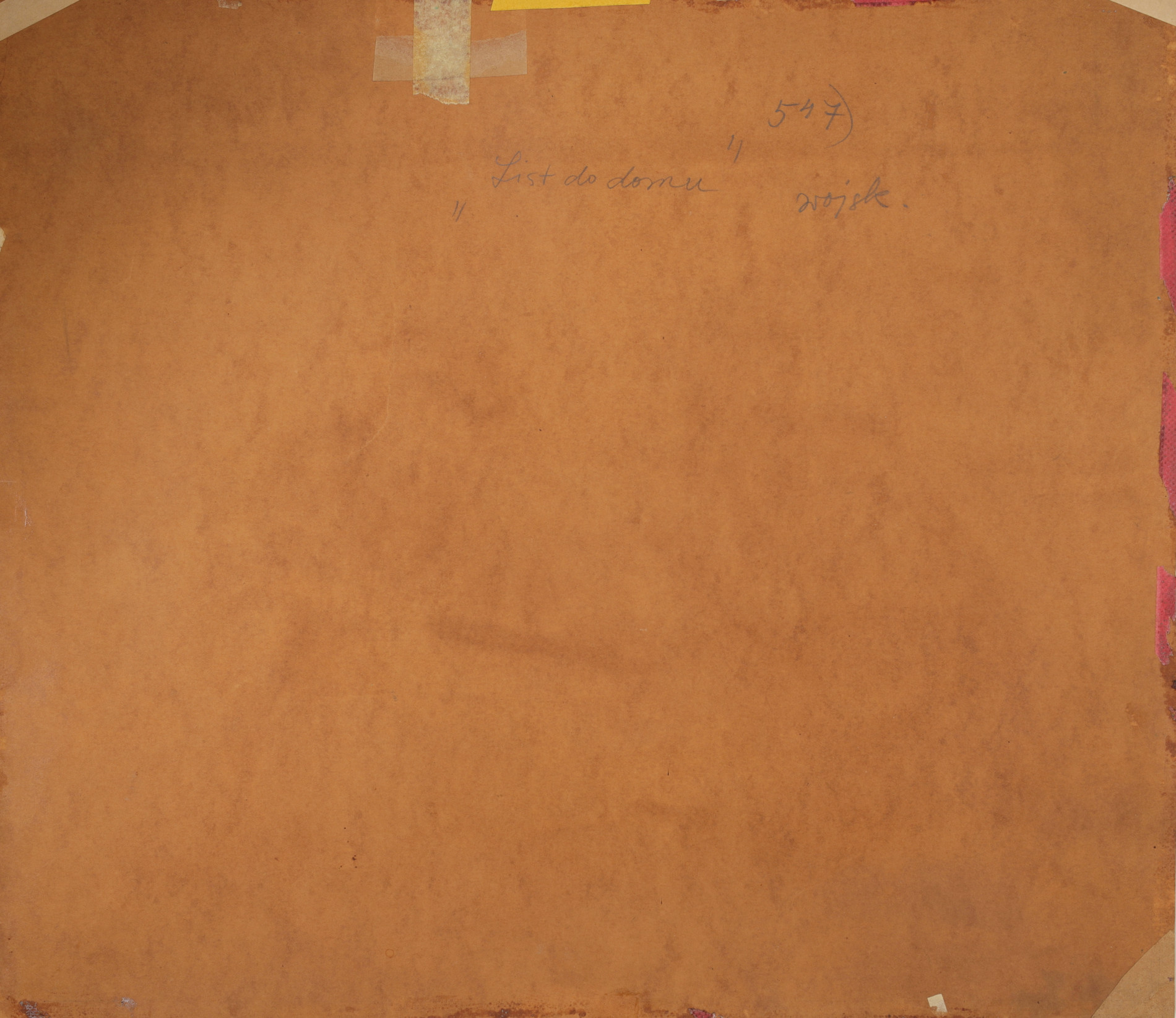 | Sygnowany i opisany l.d.: "Wlastimil Hofman | Nazaret 1944" Opisany ołówkiem na odwrocie: "547) | List do domu | wojsk." Widoczne zabrudzenie malatury. Lokalnie widoczne niewielkie ubytki farby. Śr.g. widoczny ślad po pęknięciu podłoża (obecnie podklejony). Obraz został sprzedany na 52. Aukcji Dzieł Sztuki Krakowskiego Domu Aukcyjnego (24 III 2026) [ZOBACZ WYNIKI] | |