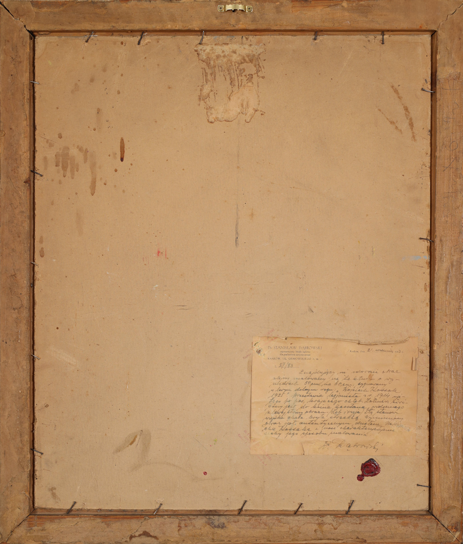 | Sygnowany i datowany l.d.: "Wojciech Kossak | 1925" Na odwrocie pieczęć lakowa z herbem rodu Kossaków. Na odwrocie opinia dra Stanisława Dąbrowskiego z 1953 roku. | |