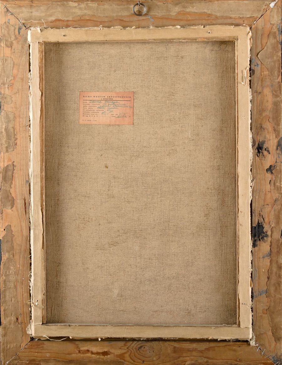 | sygn. p.g.: "Z.Pronaszko Kraków | 48." na odwrocie metka Biura Wystaw Artystycznych w Krakowie OPIS PRACY: „Portret chłopca” Zbigniew Pronaszko namalował już w okresie powojennym, kiedy to w jego twórczości nastąpiły pewne zmiany - artysta ograniczył wówczas wykorzystywaną gamę barw i zaczął używać stonowanych, ciemnych kolorów. Przedstawione dziecko ujęte zostało w półpostaci, en trois quarts. Ubrane jest w białą koszulę i przypięte ciemnobrązowymi szelkami spodenki. Twarz chłopca ma poważny wyraz, a jego nieruchomy wzrok skierowany jest poza ramę obrazu. W prawej ręce trzyma on ciemnoczerwone jabłko, które ożywia kompozycję stanowiąc akcent kolorystyczny, a przy tym nadaje pracy wymiar symboliczny. Obraz namalowany został szerokim pędzlem, grubą warstwą farby. Jego malarskość nie przeszkodziła jednak artyście w realistycznym ujęciu modela. PRACA ZOSTAŁA SPRZEDANA na IV Aukcji Dzieł Sztuki w Krakowskim Domu Aukcyjnym (16 lipca 2020) [zobacz więcej - link] | |
