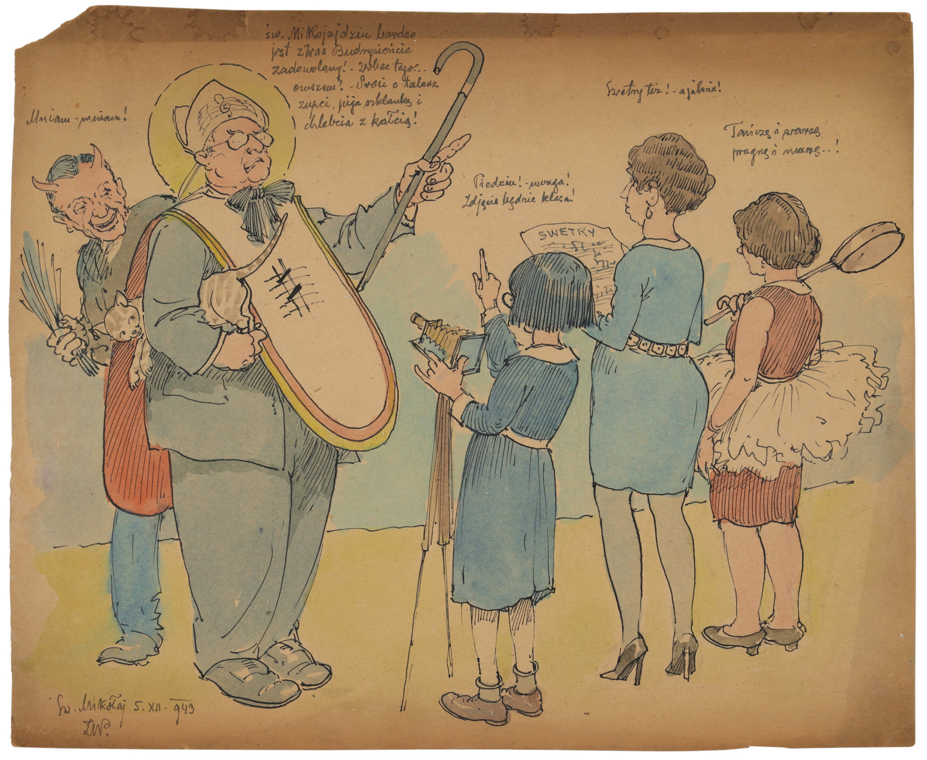 | Sygnowany l.d. monogramem: "ZW." Opisany p.d.: "Św. Mikołaj 5.XII.943." Widoczne uszkodzenie podłoża w lewym górnym narożniku oraz odbarwienie papieru przy górnej krawędzi. | |